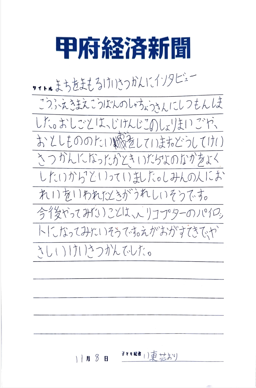 こうふえきまえこうばんのしゃちょうさんにしつもんしました。おしごとは、じけんじこのしょり まいごやおとしもののたいおうをしています。どうしてけいさつかんになったかときいたらよのなかをよくしたいからといっていました。しみんの人におれいいわれたときがうれしいそうです。
