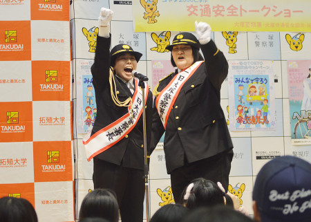 警視庁大塚署は2日、お笑いコンビ「ヨネダ2000」を招き、拓殖大で交通安全イベントを開催。持ちネタをアレンジし、「絶対に~、交通ルール守ろうね~」と盛り上げ、飲酒運転しないことなどを呼び掛けた。 【時事通信社】