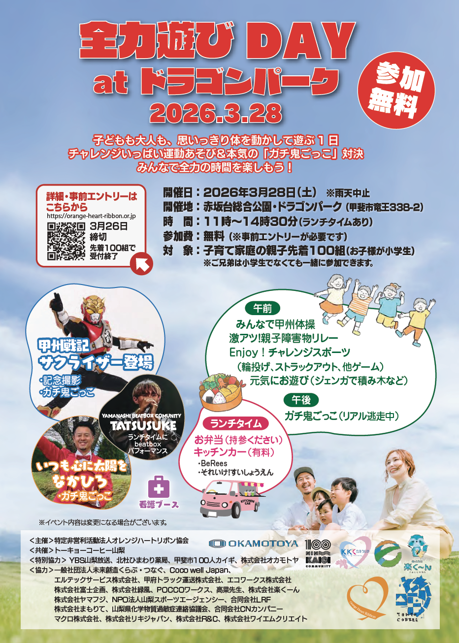 赤坂台総合公園・ドラゴンパーク(甲斐市竜王)で3月28日、子育て家庭を対象とした運動イベント「全力遊び DAY at ドラゴンパーク」が開催される。
