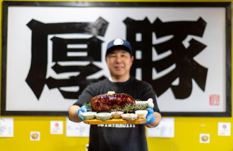 甲府の厚豚料理専門店「豚屋巣窟(ぶたやあじと)」(甲府市徳行5)で4月20日、総重量約2.23キログラムの巨大骨付き塊肉メニュー「宴肉(うたげにく)」の提供を始めた。