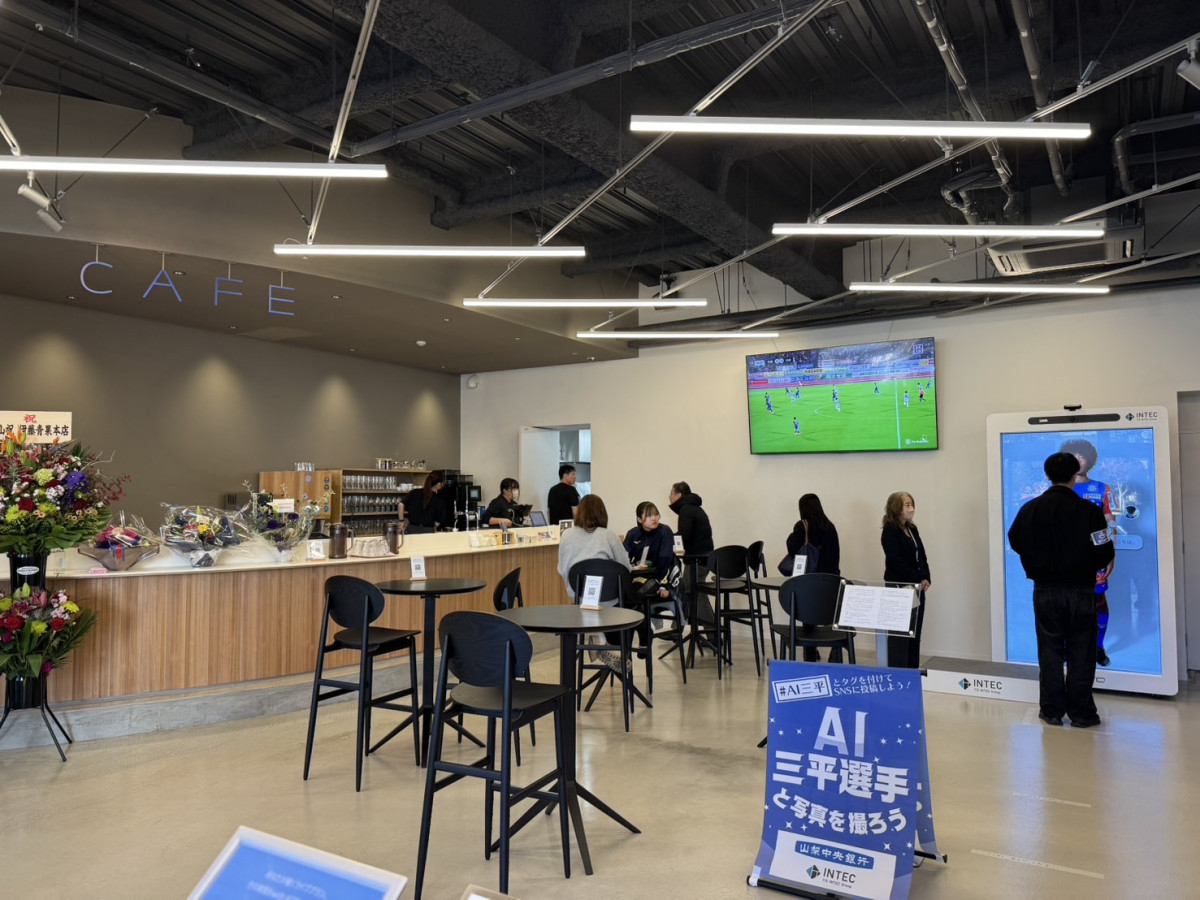 ヴァンフォーレ甲府のオフィシャルグッズショップとカフェバーは、日中はカフェ、夜はスポーツバーとして運営。2階にはイベントスペースを設け、クラブ主催のイベントや健康教室、銀行主催の金融セミナーなども開催し、地域内の新たなコミュニティーの創出を目指す。