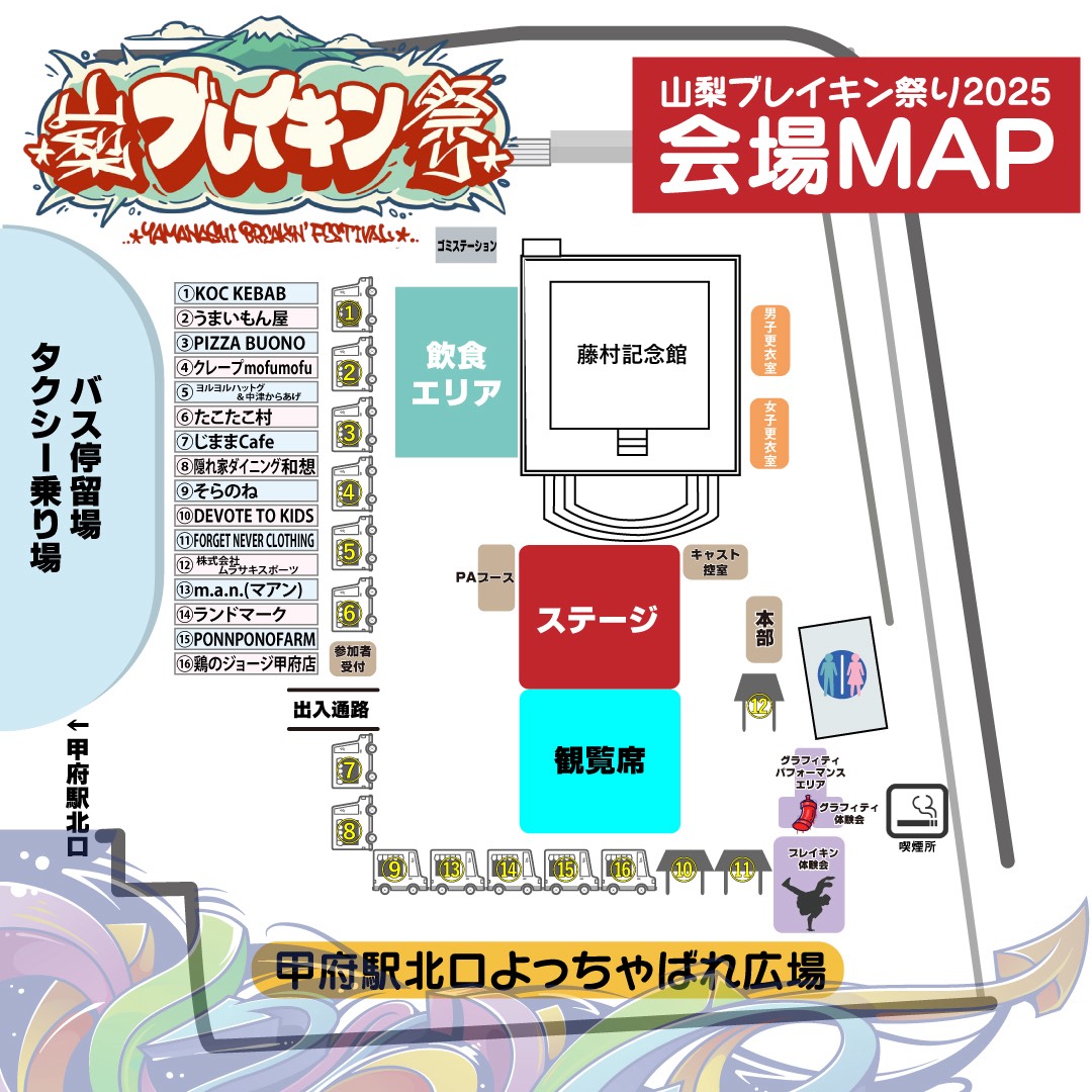 キッズや若者の参加を促進し、地域のにぎわい創出やスポーツとカルチャーの融合を図ることを目的に開く同イベント。昨年はダンサー約300人が参加し、約3000人が来場した。今回もパリ五輪で注目された新競技のブレイキンを主軸に、U15ソロバトルや年齢制限なしの2on2バトル、ダンスショーケース、無料体験会、グラフィティアートパフォーマンスを繰り広げ、14店以上のキッチンカーや飲食・物販店舗も出店する。入場・観覧と体験会は無料で、バトルエントリーは3,000円、ダブルエントリーは5,000円。賞金・商品は総額30万円で、特別表彰として「山梨県知事賞」「甲府市長賞」などを設ける。