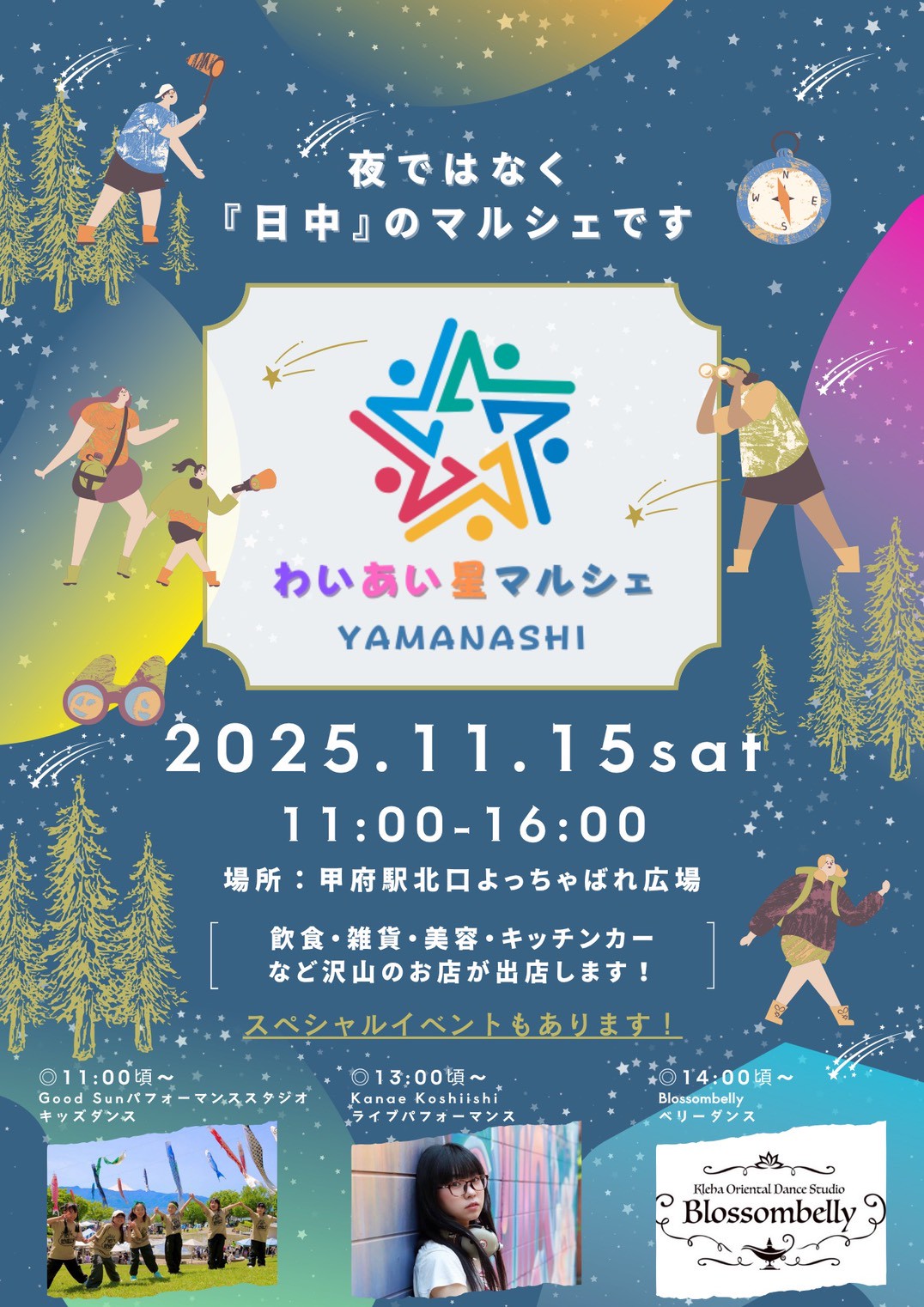 toカンパニー代表の大高翼さんは「今回は、スペシャルイベントとしてキッズダンスやライブ、ベリーダンスなども用意する。山梨のマルシェといえば『わいあい星マルシェ』と多くの人に思い浮かべてもらえるよう、 地域に根差し、愛されるイベントとして育てていければ」と意気込む。