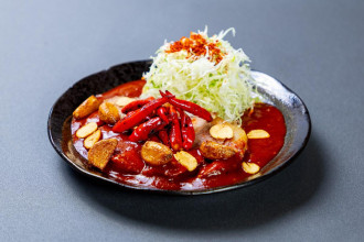 辛さのレベルは、「朱炎(しゅえん)」(1,190円)、「紅蓮(ぐれん)」(1,490円)、「黒焔(こくえん)」(1,690円)、「閻魔(えんま)」(2,550円)の4段階。提供内容は厚切り豚肉約130グラム、ご飯150グラム、みそ汁、副菜小鉢。「閻魔」は完食チャレンジの対象で、唐辛子にはトリニダード・スコーピオン、キャロライナ・リーパー、ドラゴンズ・ブレスといった世界的に辛さが知られる品種を使う。 さらに山梨のご当地調味料「すりだね」も使い、地域色も感じられる味に仕上げたという。