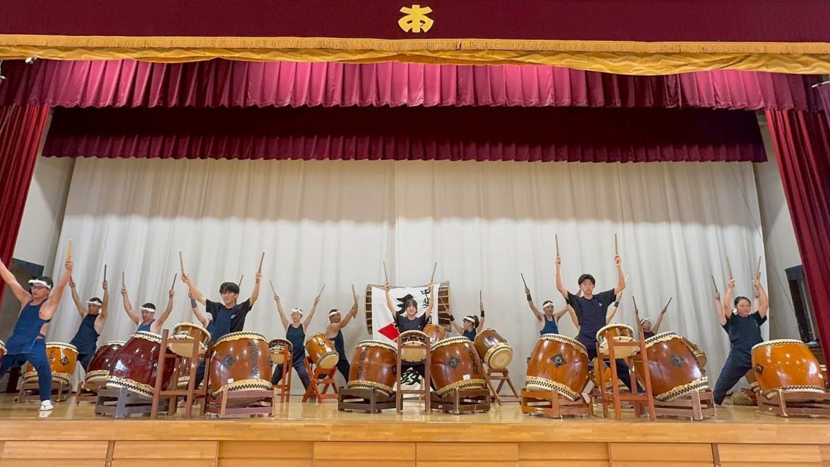 笛吹市立浅川中学校(笛吹市石和町松本)で10月3日に開かれたPTA教育講演会で、地域の和太鼓団体「甲斐乃國御坂天雷太鼓保存会」が公演を行った。
