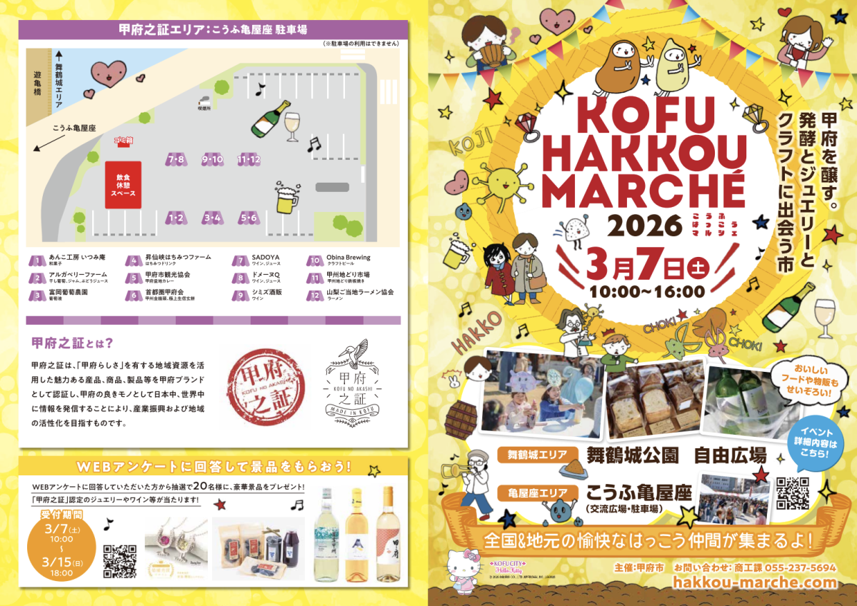 発酵・ジュエリー・クラフトが集う「こうふはっこうマルシェ2026」が3月7日、舞鶴城公園自由広場とこうふ亀屋座(甲府市丸の内1)で開催される。
