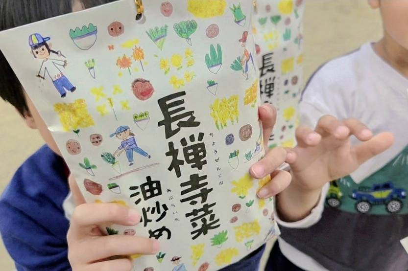 山梨学院幼稚園(甲府市酒折2)の5歳児クラスの園児たちが手がけた「長禅寺菜油炒め」のパッケージデザインが3月18日、同園でお披露目された。