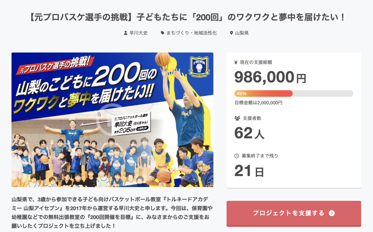 笛吹市出身の元プロバスケットボール選手早川大史さんが現在、無料の出張バスケットボール教室「アイセブンキャンバス」の継続に向けてクラウドファンディングで支援を呼びかけている。